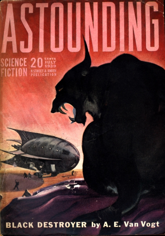 In the novel, Mykel’s boss at the radio station, Sol Ketner, had been on a network radio show entitled Stories From the Charnel House. He not only played the narrator, Old Ichabod, the keeper of the charnel house, but occasionally other voices. The show was cancelled after they produced a version of A. E. Van Vogt’s The Black Destroyer. Mr. Ketner even provided the voice of the giant, cat-like alien Coeurl, which he described as doing “an evil meow.” What got them cancelled was complaints about the Coeurl disemboweling one of the crewmembers on the spaceship and decapitating another.