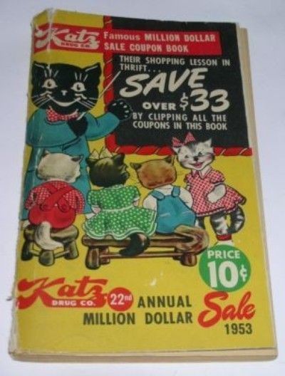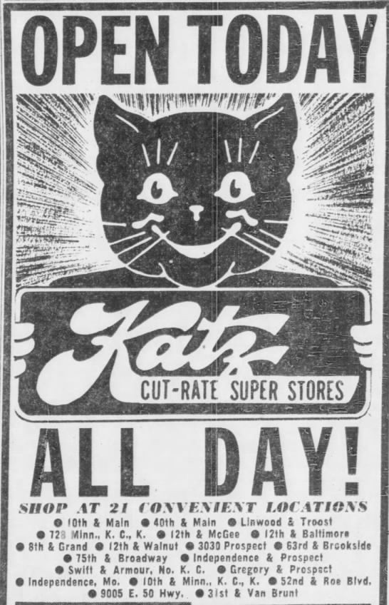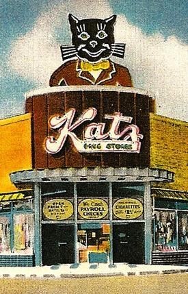 Katz began as a chain of drug stores in Kansas City, Missouri. They were usually located on a corner in art deco building. One mainstay of Katz from the beginning was the smiling, anthromorphic, black cat, dressed to the nines. Often the cat was winking.