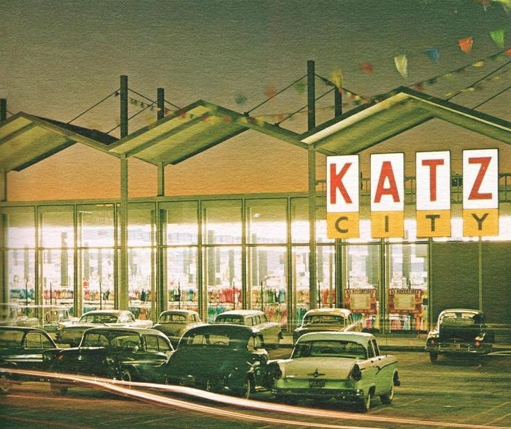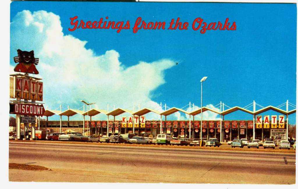 By the early Sixties, Katz were branching out of K. C to other cities with large discount stores, which sold liquor, clothes, tools, appliances & records. They also had a snack bar & lunch counter. These stores were in large Googie architecture buildings.
