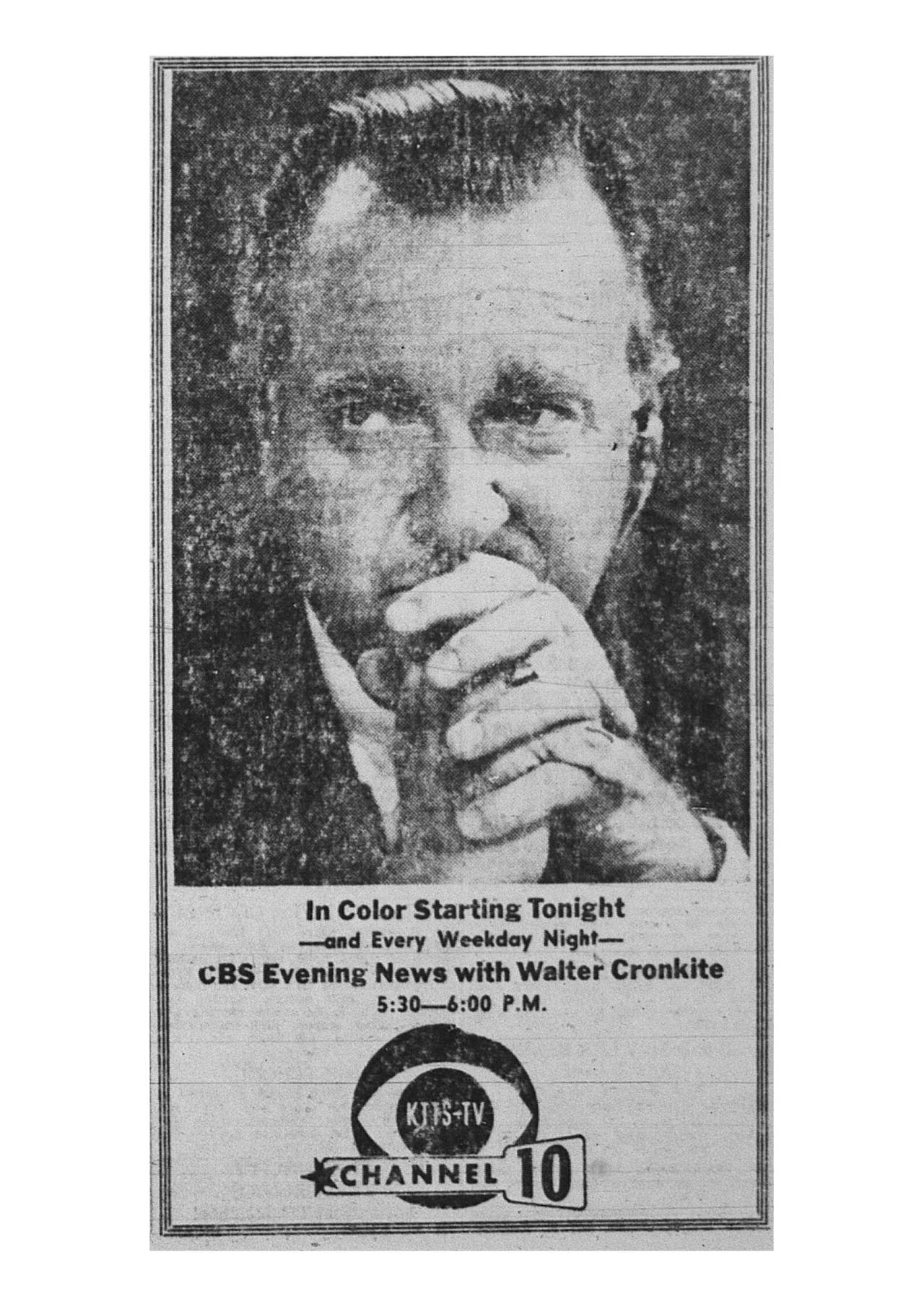 Color on television was a big deal in the mid 60s. Television news was the last programs to switch to color. The CBS Evening News with Walter Cronkite went to color in February of 1966. The Huntley & Brinkley Report on NBC & the ABC World News would not go to color broadcast until later in the decade.