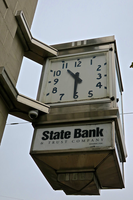Mykel and Clint walked into the black, marble, bank building with white colonnade in front of green glass windows and with aluminum louvers. Clint stopped and looked at the time and temperature sign, sticking out from the corner of the building, then looked at his watch.